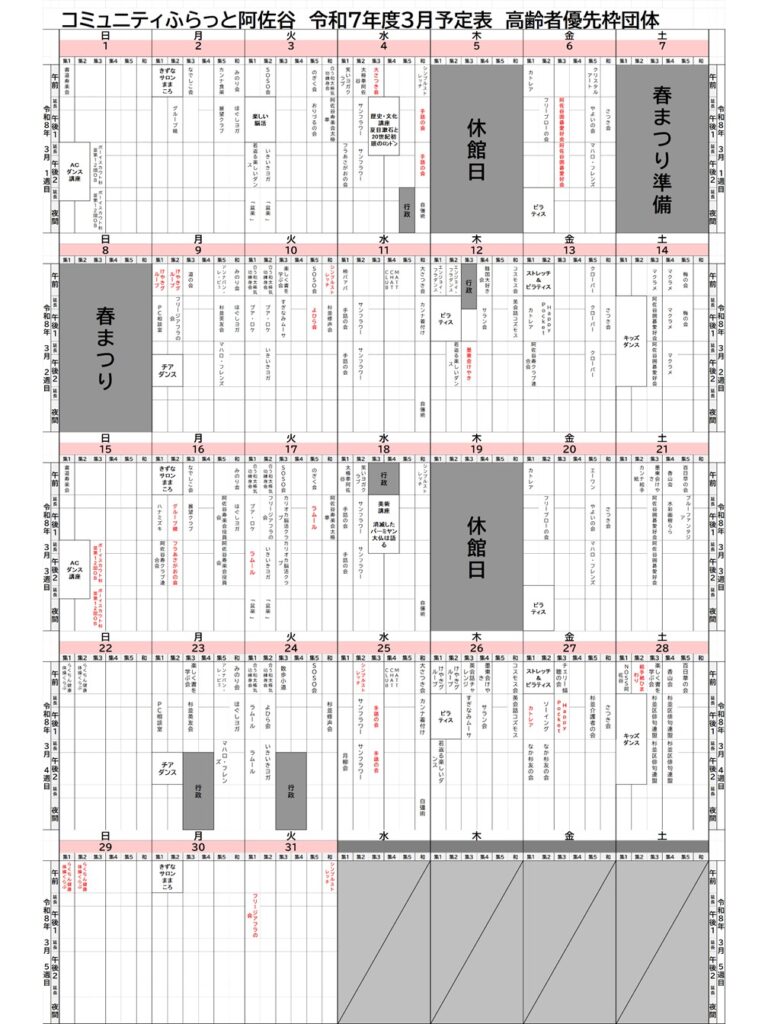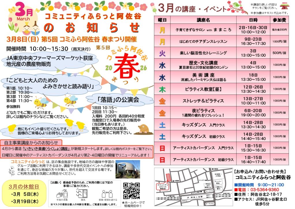 コミュニティふらっと阿佐谷 3月のお知らせ 2026年2月20日 お知らせ 平素よりコミュニティふらっと阿佐谷をご利用いただき誠にありがとうございます。毎月館内にて配布しております「コミュニティふらっと阿佐谷のお知らせ」がホームページでもご覧いただける様になりました。スケジュールの確認などに是非ご活用ください。 お知らせPDF 表(920KB)・裏(627KB) Share: Older Post 3月8日 第5回 コミふら阿佐谷春まつり開催!!